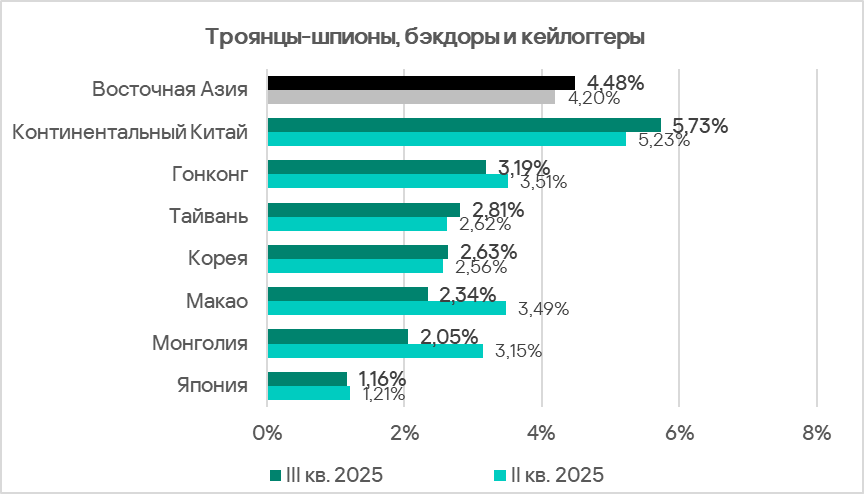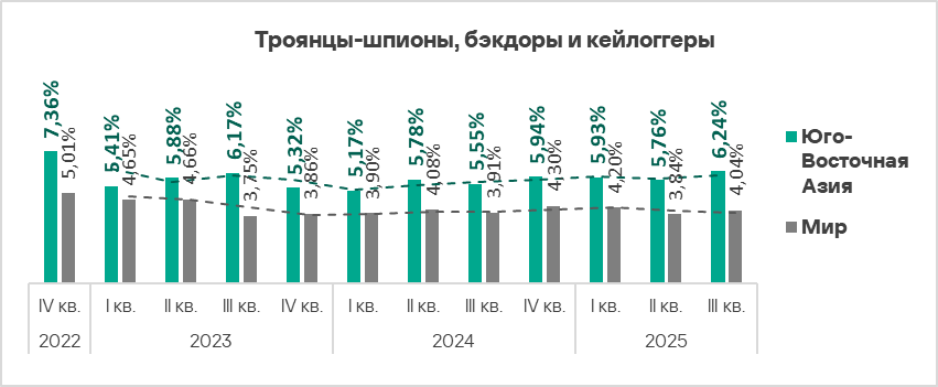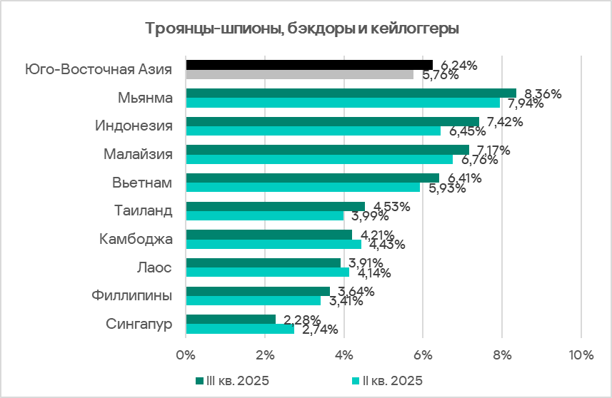 Среди стран региона по доле компьютеров АСУ, на которых заблокированы программы-шпионы, лидирует Мьянма с 8,36%. В Сингапуре показатель наименьший — 2,28%. Показатель вырос во всех странах, кроме Сингапура, Лаоса и Камбоджи.