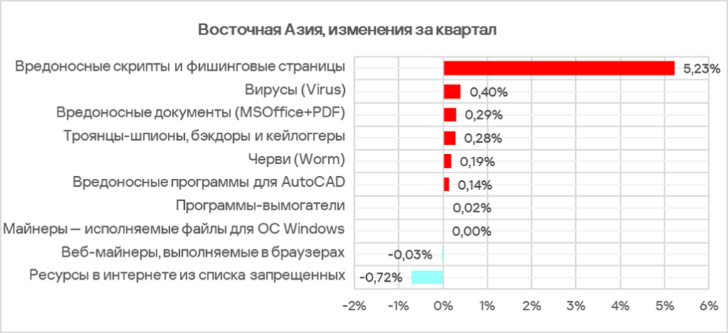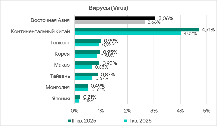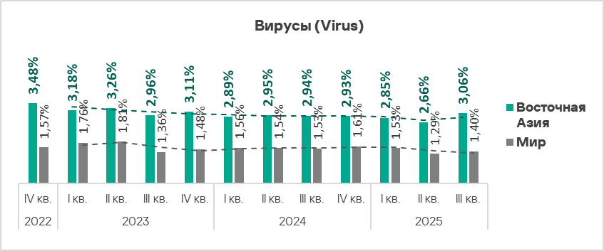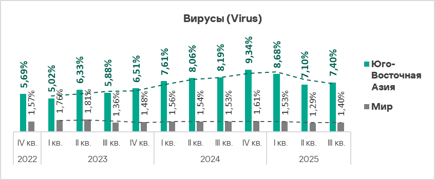 В Юго-Восточной Азии в рейтинге категорий угроз вирусы находятся на втором месте. Это единственный регион, где эта категория угроз находится насколько высоко.