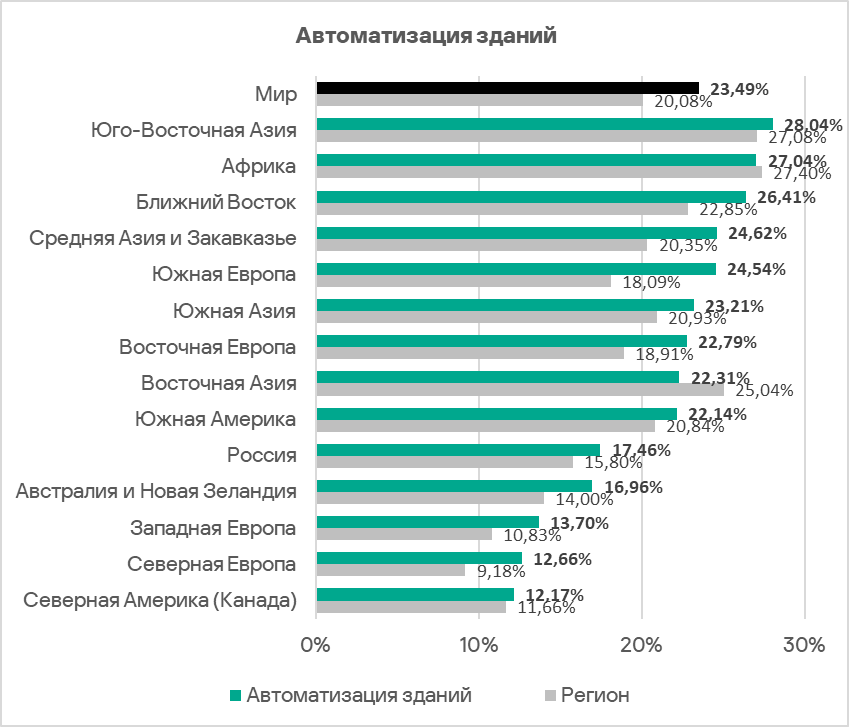 Юго-Восточная Азия – лидер среди регионов по доле компьютеров АСУ, на которых были заблокированы вредоносные объекты в отрасли автоматизация зданий.