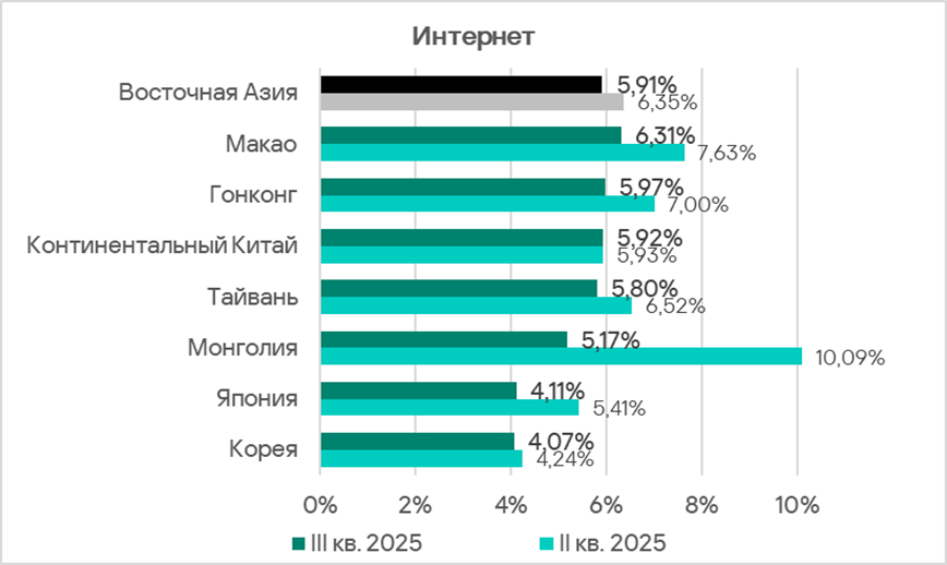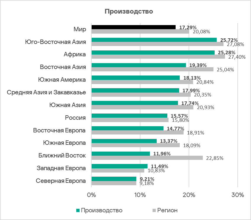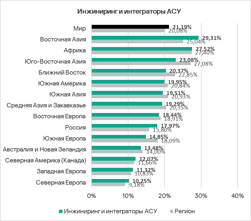 По доле компьютеров АСУ, на которых были заблокированы угрозы из интернета, Юго-Восточная Азия занимает второе место в рейтинге регионов с показателем, который превышает минимальный — у Северной Европы — в 2,2 раза.
