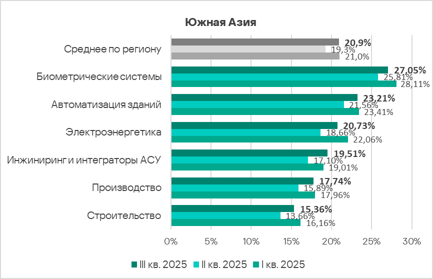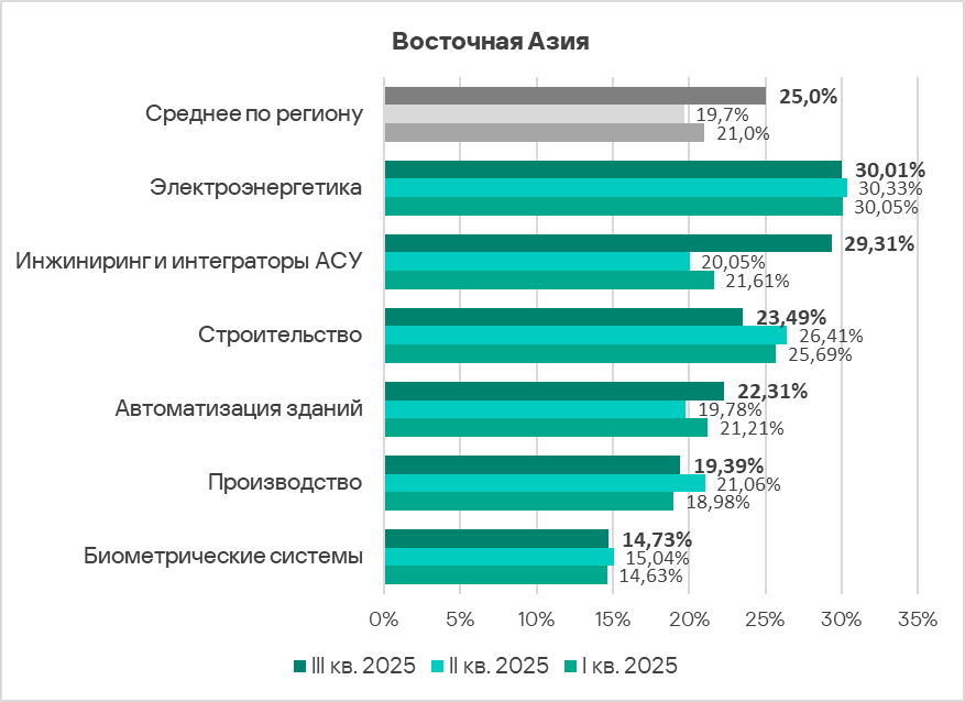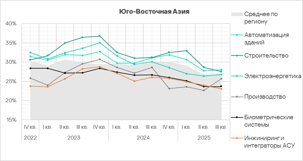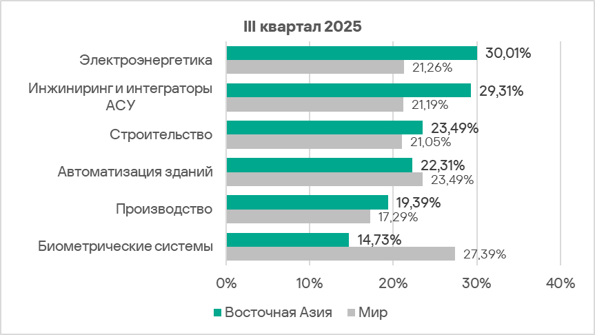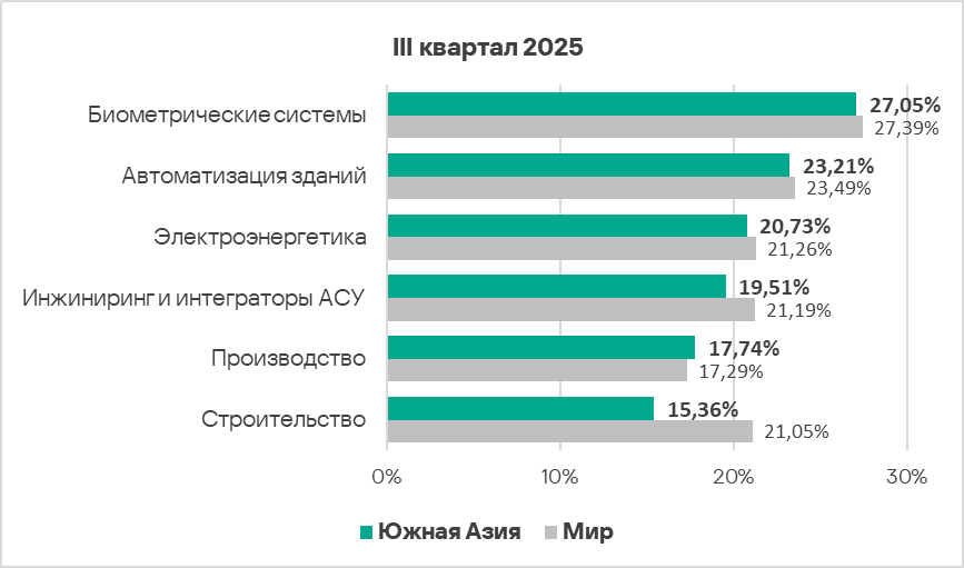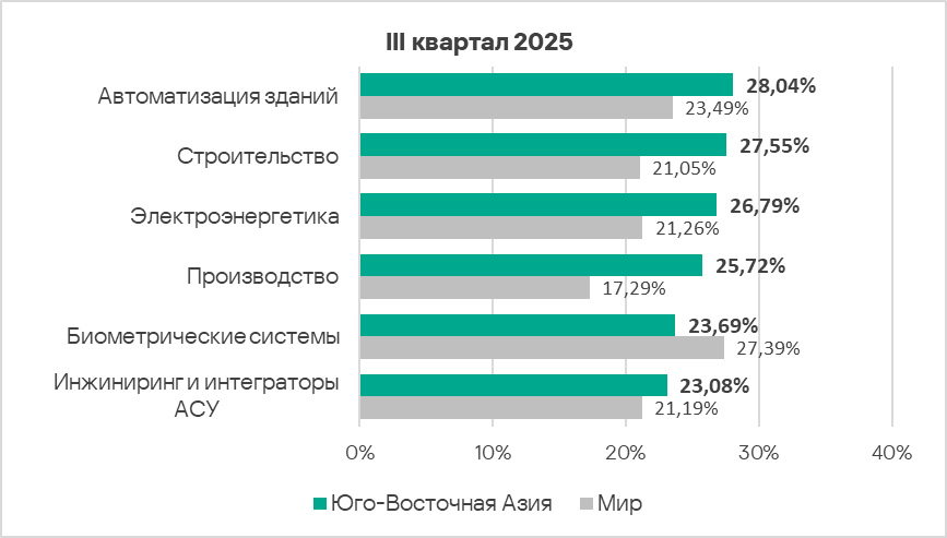 В третьем квартале 2025 года в Юго-Восточной Азии по доле компьютеров АСУ, на которых блокируются вредоносные объекты, среди рассмотренных в отчете отраслей автоматизация зданий обогнала строительство.