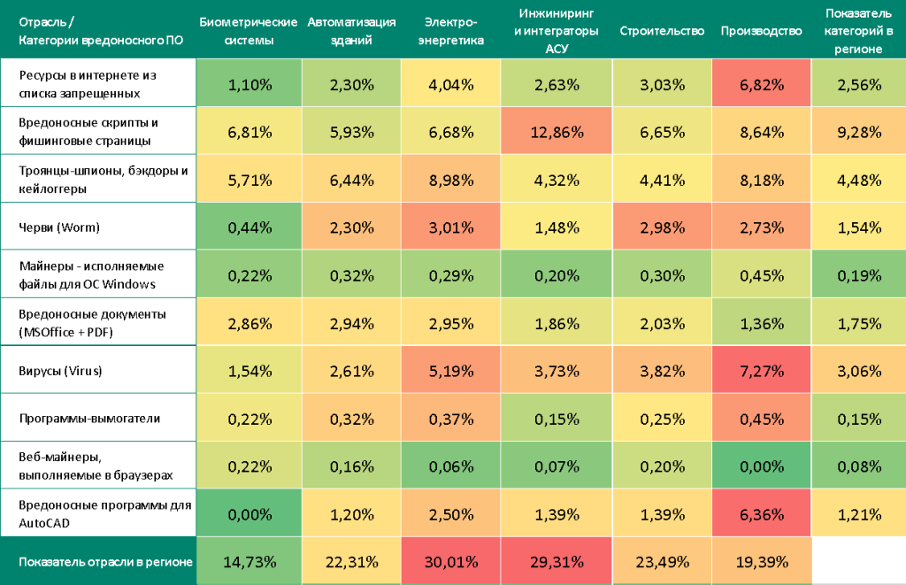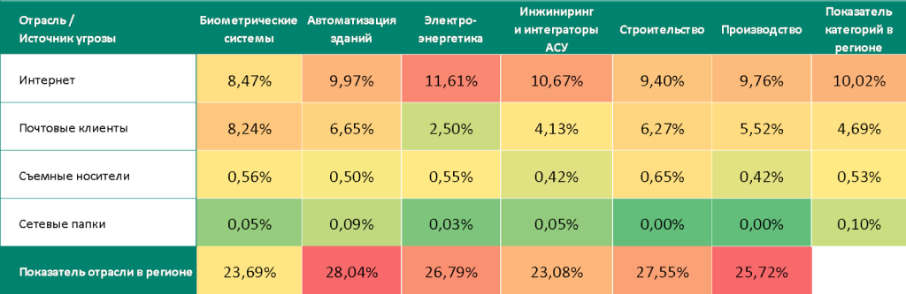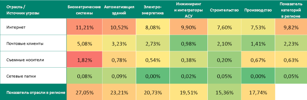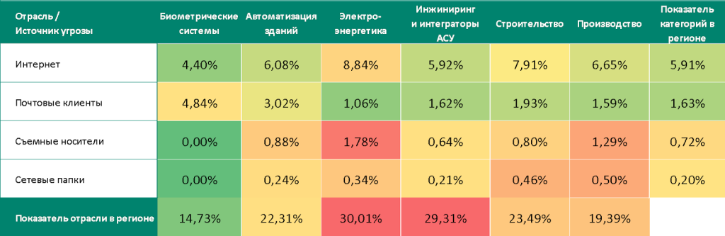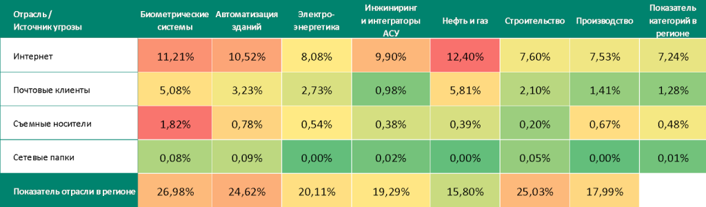 При оценке проблем отраслей в регионах мы используем тепловые карты. Цвет на карте определяет положение показателя в глобальном рейтинге отраслей в регионах (отдельно по каждой категории угроз или каждому источнику). Красный цвет указывает на то, что значение близко к максимальному.