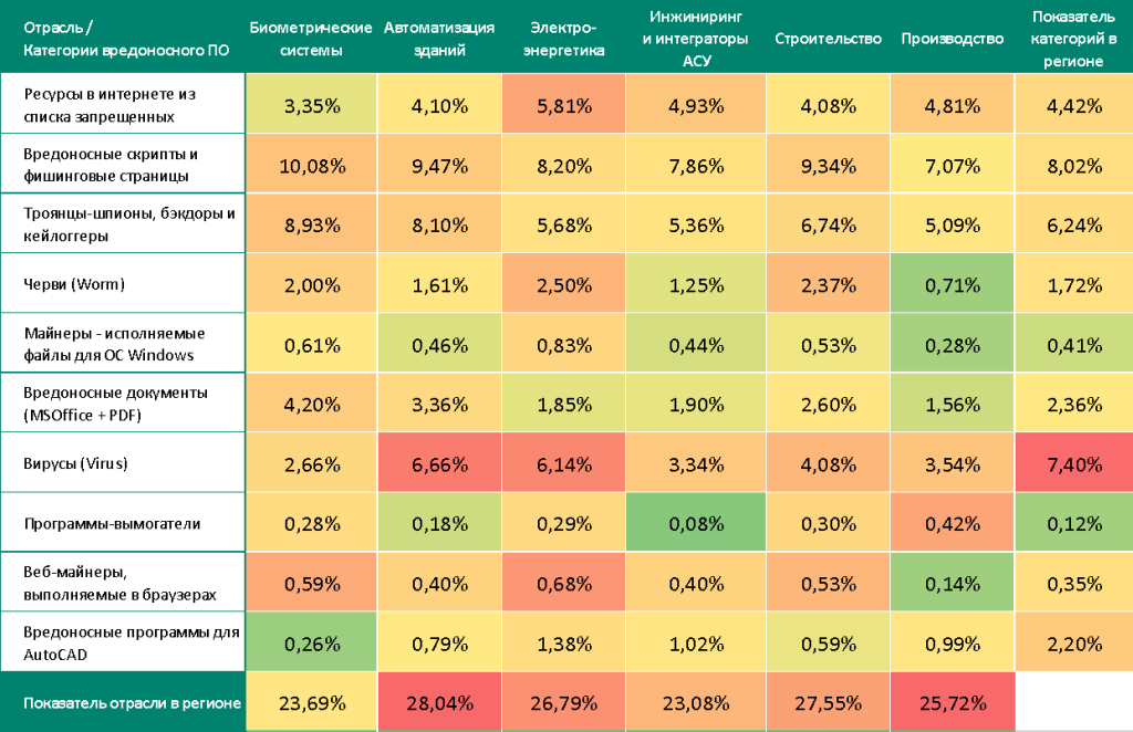 Среди отраслей в регионе автоматизация зданий – единственная, где на компьютерах АСУ блокировались угрозы в сетевых папках. Кроме того, она занимает: