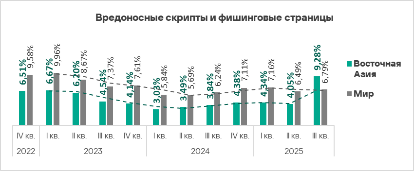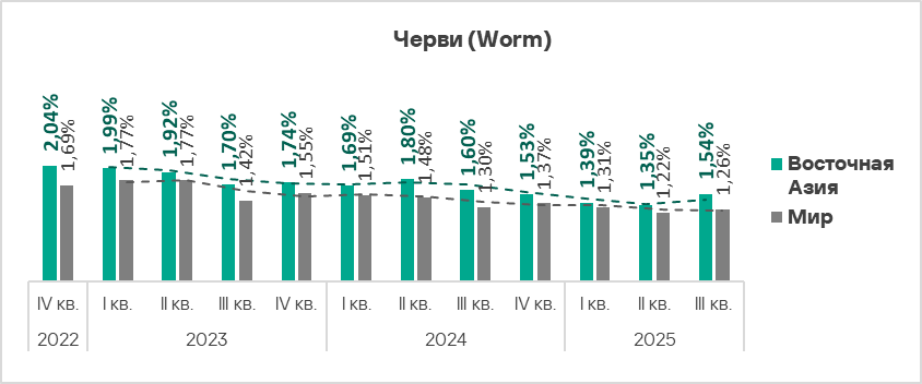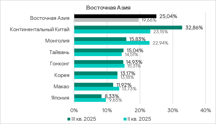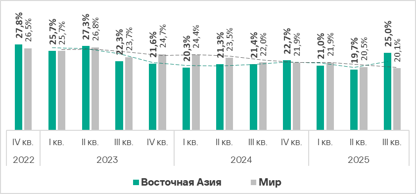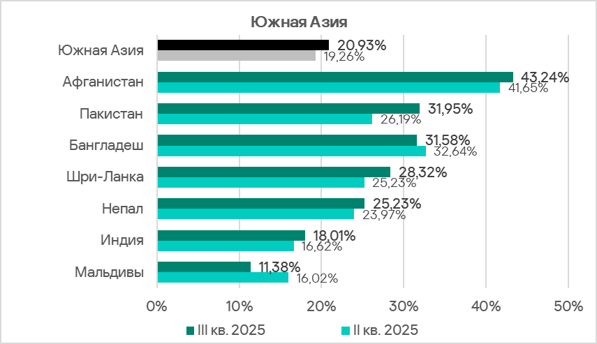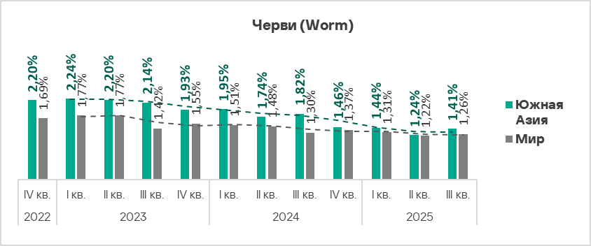 После уменьшения показателя региона в двух предыдущих кварталах, в третьем квартале 2025 года доля компьютеров АСУ, на которых были заблокированы вредоносные объекты в Юго-Восточной Азии, увеличилась, но не вернулась к значениям конца 2024 года.