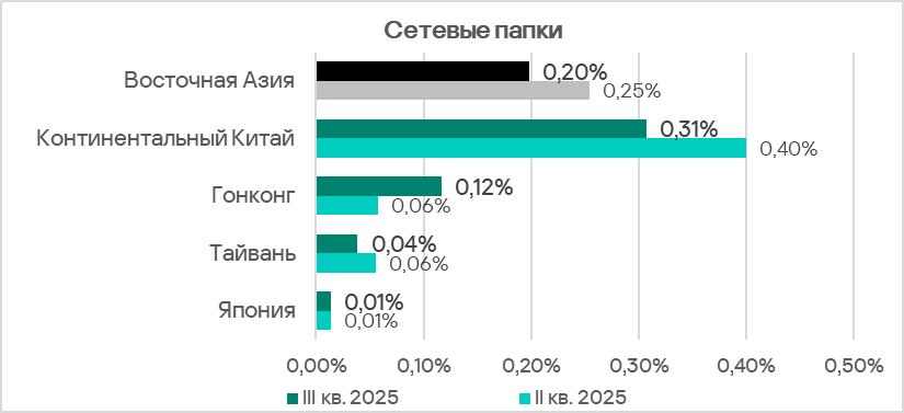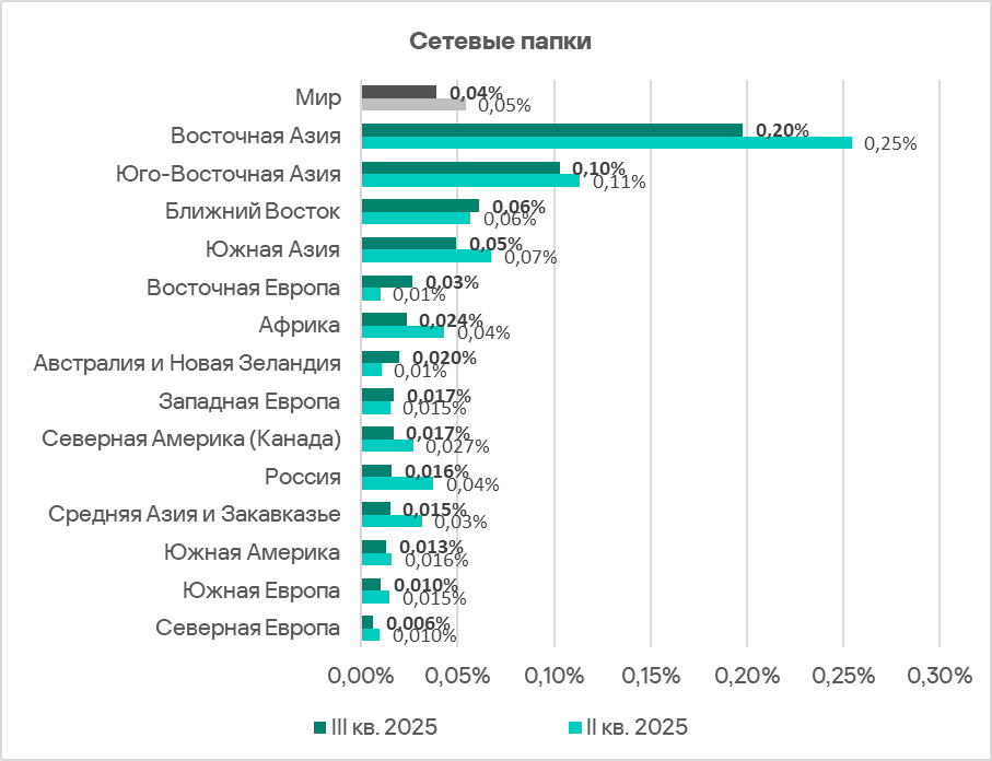 Юго-Восточная Азия занимает второе место среди регионов по доле компьютеров АСУ, на которых угрозы блокируются в сетевых папках, с 0,10%, уступая только Восточной Азии.