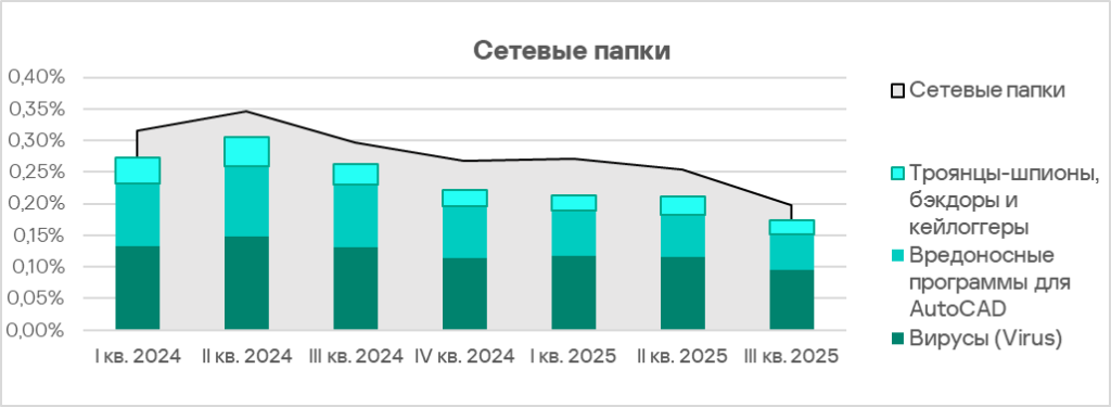 Основными категориями угроз, которые распространяются через сетевые папки, являются вирусы, вредоносное ПО для AutoCAD, черви и шпионские программы. По показателю вредоносного ПО для AutoCAD Юго-Восточная Азия с большим отрывом лидирует среди регионов.