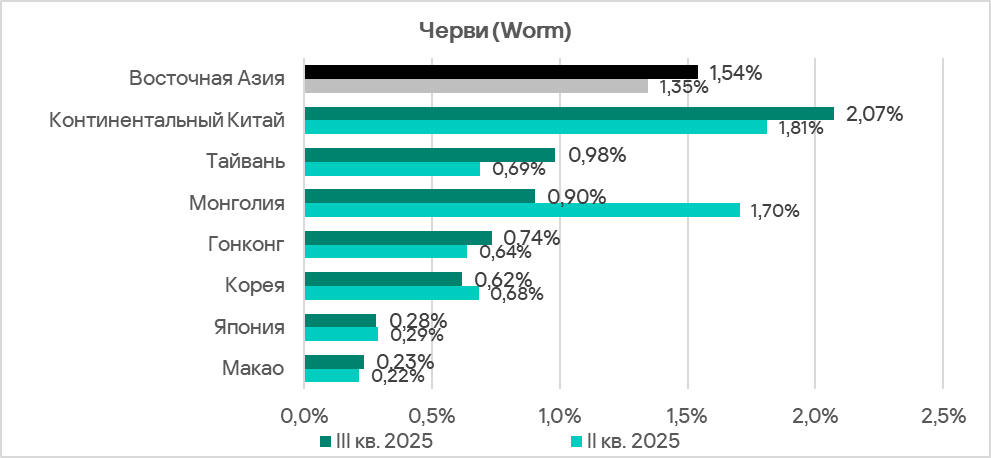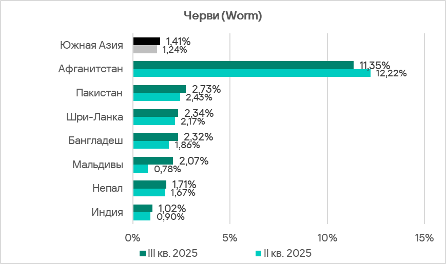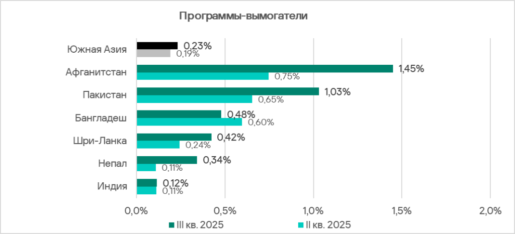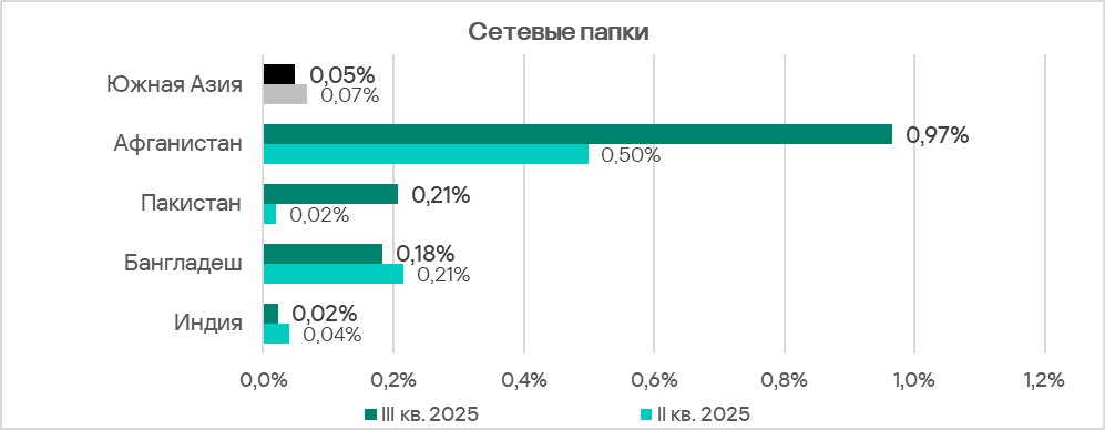 Среди стран региона по доле компьютеров АСУ, на которых были заблокированы угрозы в сетевых папках, в третьем квартале 2025 года с заметным отрывом лидирует Лаос с 0,36%.