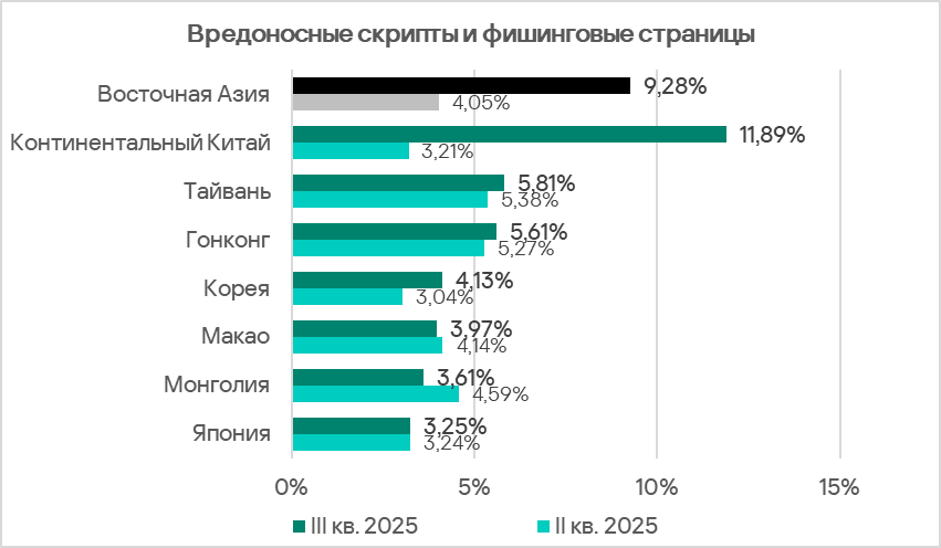 В рейтинге регионов по доле компьютеров АСУ, на которых блокируются шпионские программы, Юго-Восточная Азия в третьем квартале 2025 года поднялась на одну позицию и заняла второе место с 6,24%. Это в 4,5 раза больше показателя Северной Европы, где значение показателя минимальное.