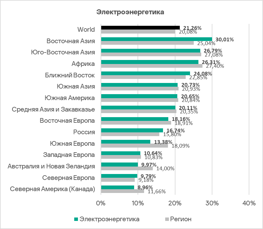 Юго-Восточная Азия находится на втором месте среди регионов по доле компьютеров АСУ, на которых были заблокированы вредоносные объекты в электроэнергетической отрасли.