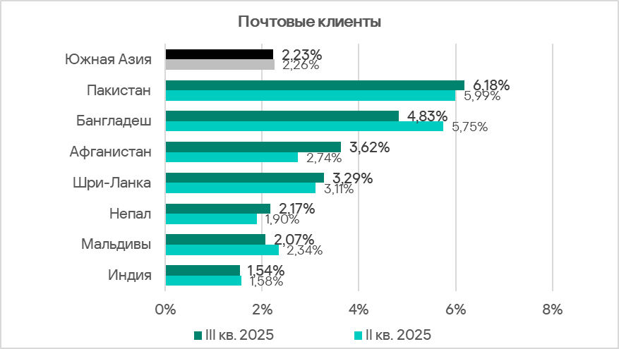 У обеих стран, возглавляющих рейтинг по съемным носителям, — Лаоса и Мьянмы — наименьшие из всех стран региона показатели по угрозам в почтовых клиентах.