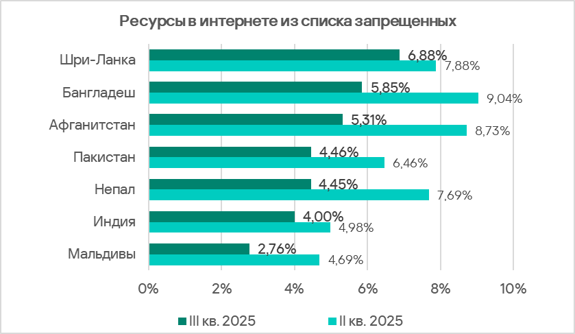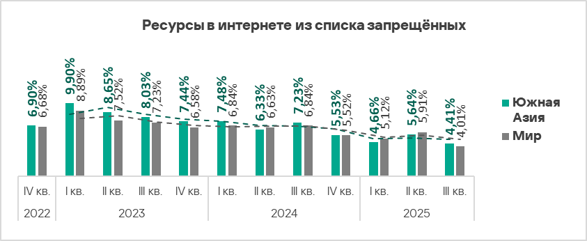 - второе место по показателям веб-майнеров и червей, третье – по показателям шпионских программ и вирусов и четвертое — по показателю ресурсов в интернете из списка запрещенных.