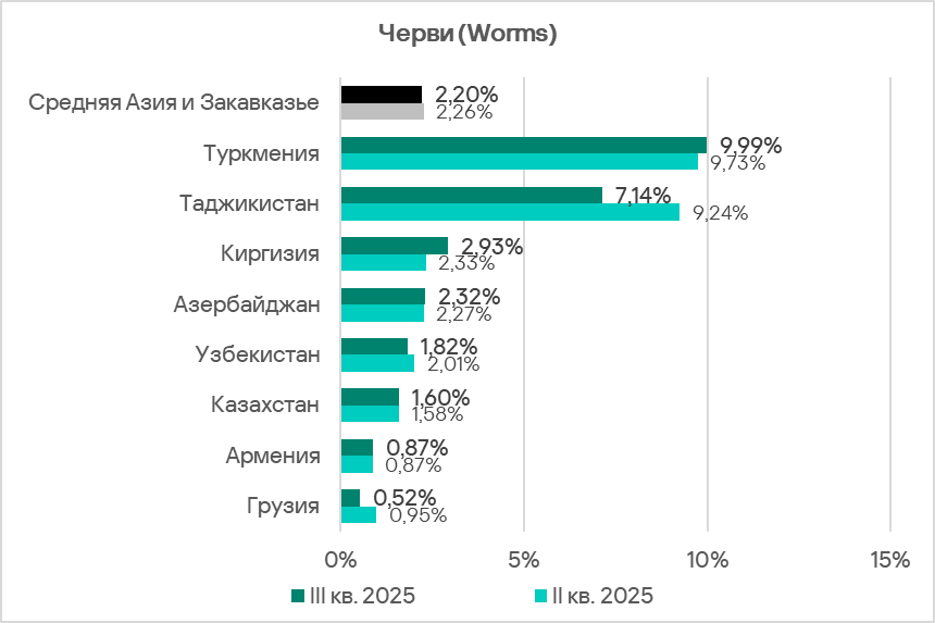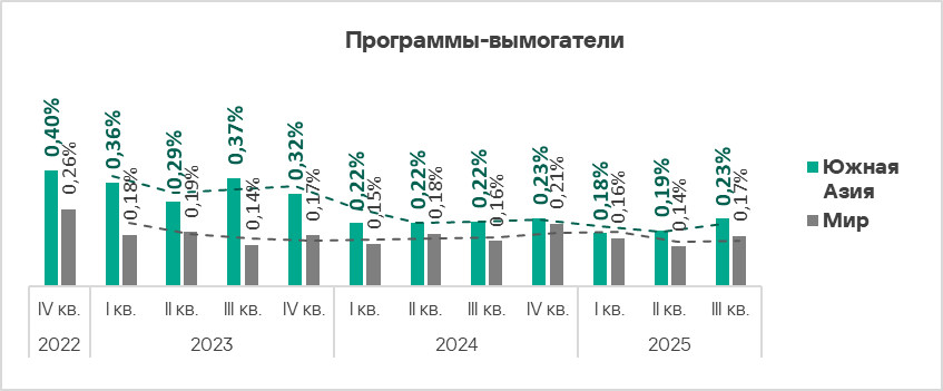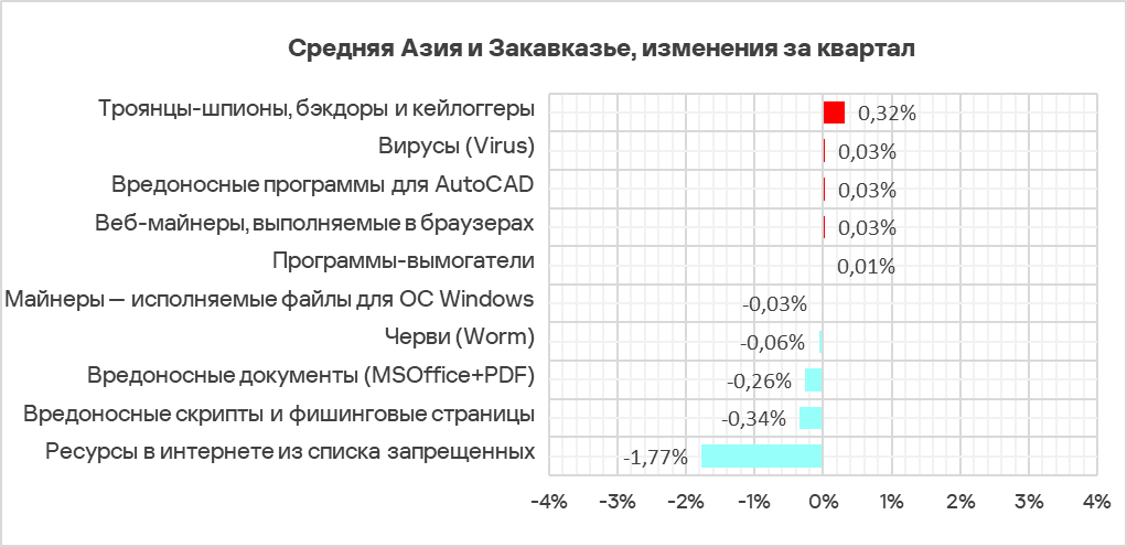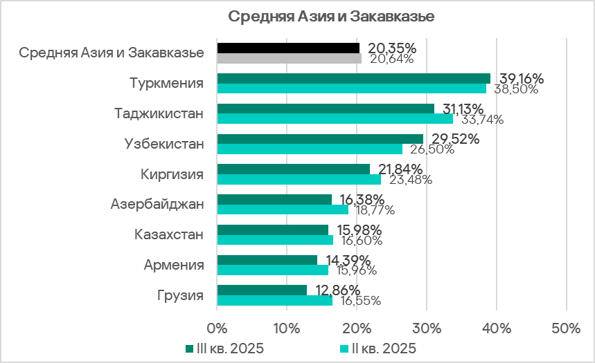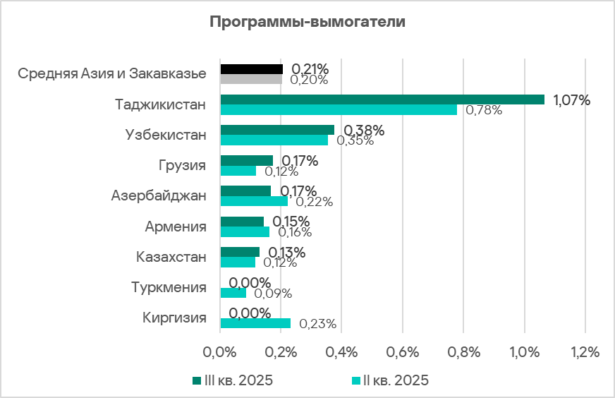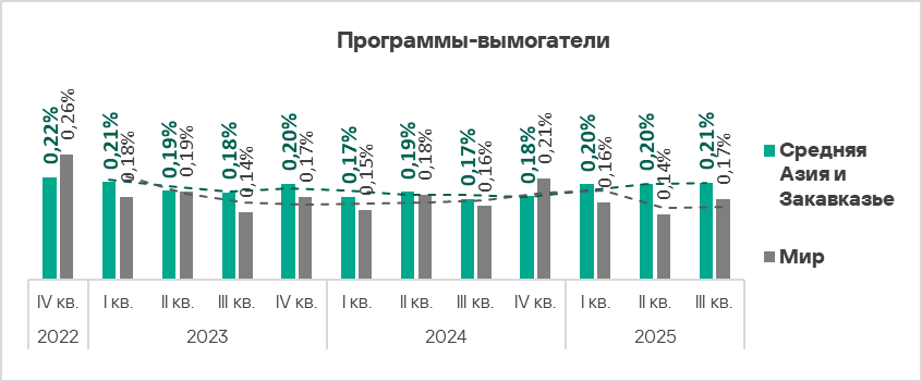Показатель программ-вымогателей в Средней Азии и Закавказье довольно стабилен и немного подрос за квартал.