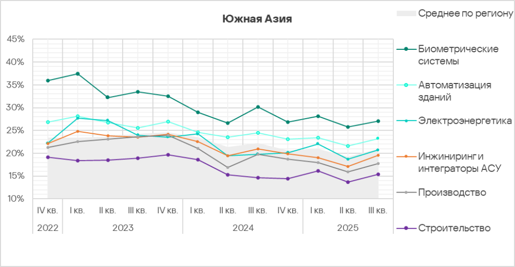 Показатели категорий угроз в отраслях в Юго-Восточной Азии, III квартал 2025 года