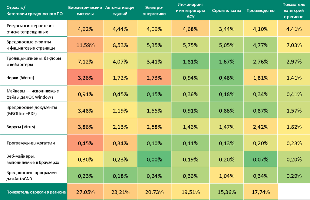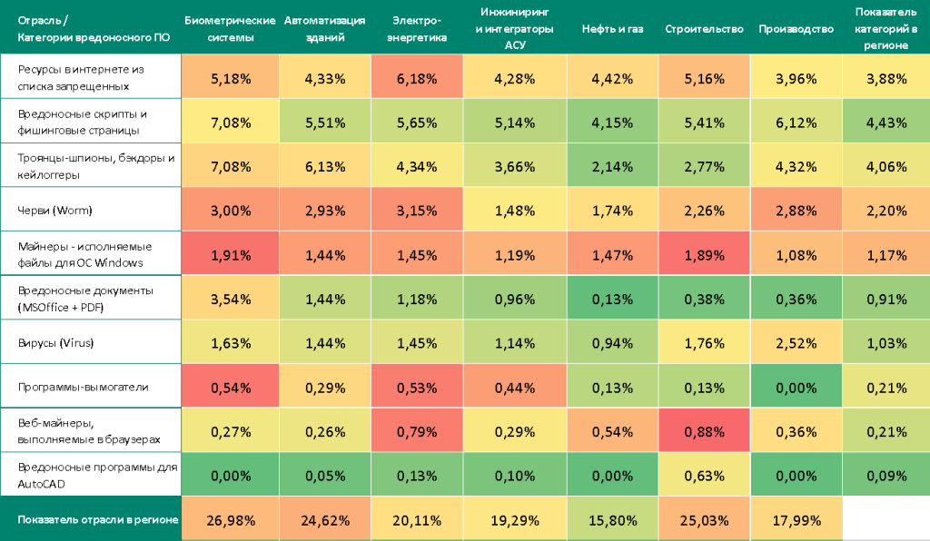 Во всех рассмотренных в отчете отраслях региона показатель категории угроз майнеры — исполняемые файлы для ОС Windows в Средней Азии и Закавказье – самый высокий среди регионов.