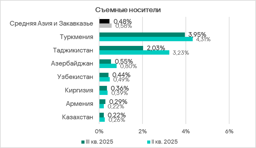 Распространяются такие угрозы преимущественно на съемных носителях. Туркмения и Таджикистан, лидирующие в этом рейтинге, на первых местах и в рейтинге по доле компьютеров АСУ, на которых угрозы блокировались при подключении съемных носителей.