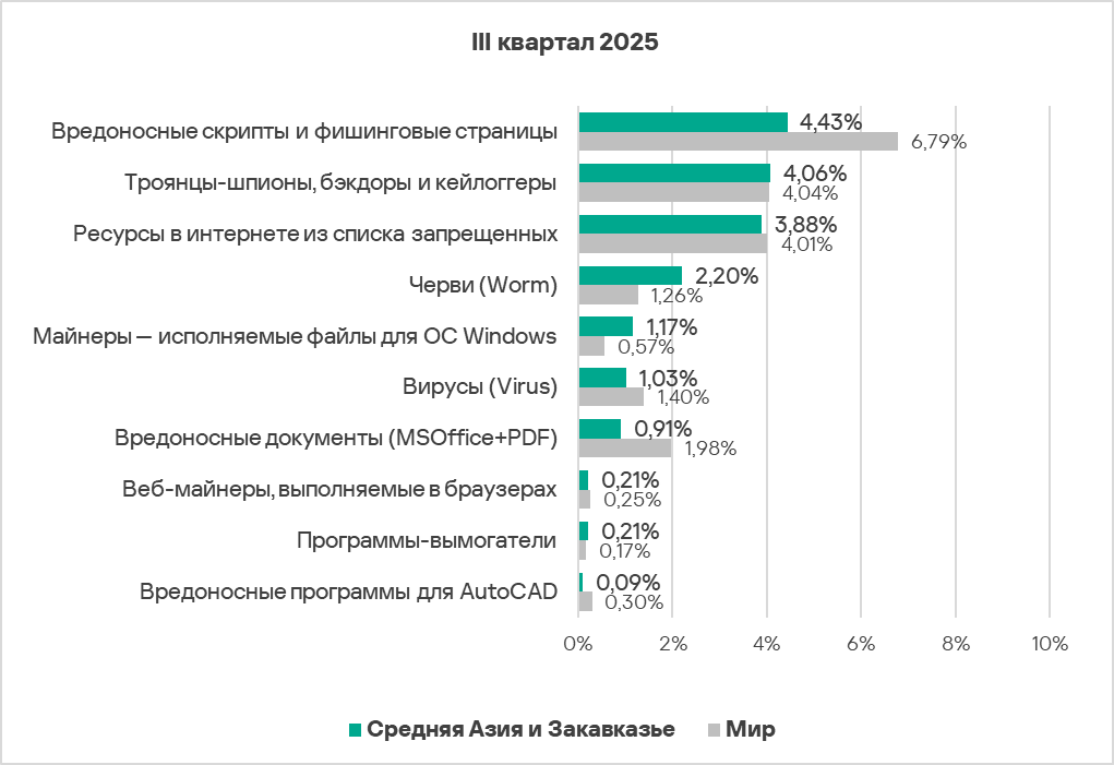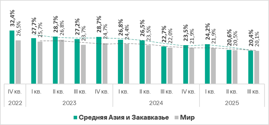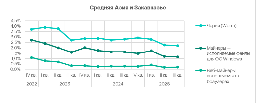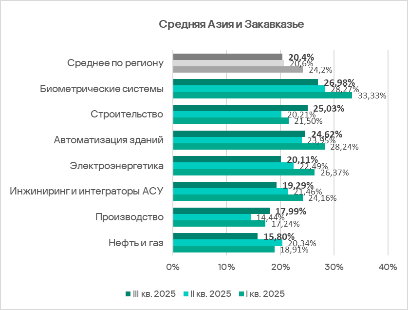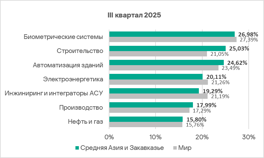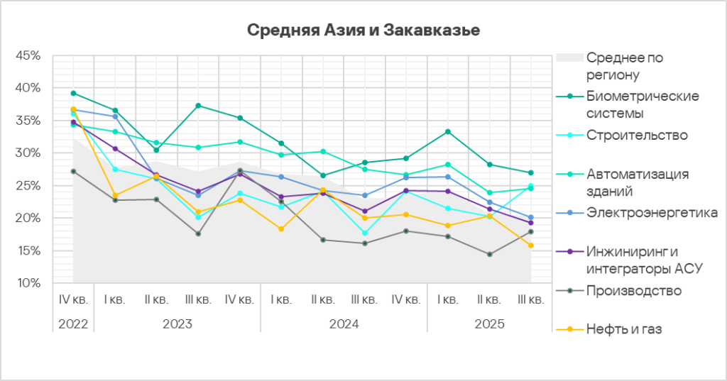 Показатели категорий угроз в отраслях в Средней Азии и Закавказье, III квартал 2025 года