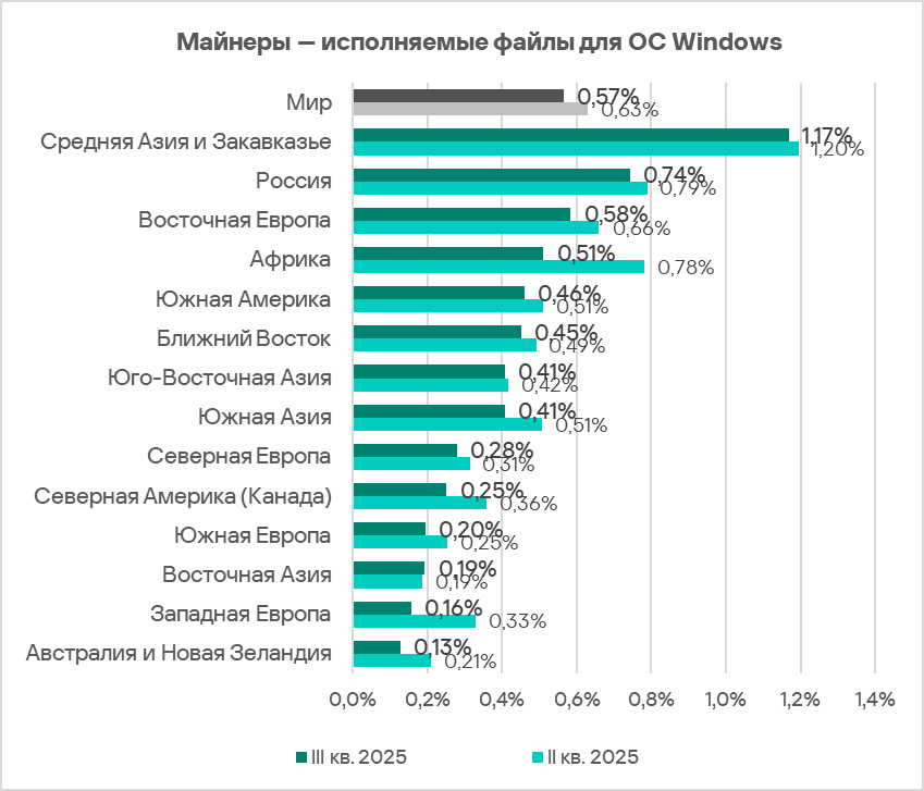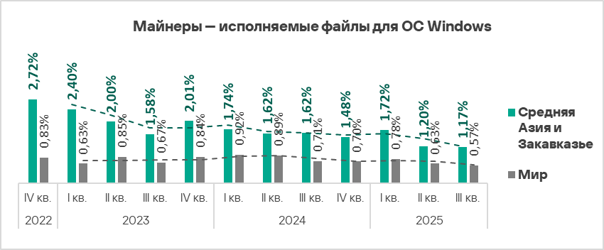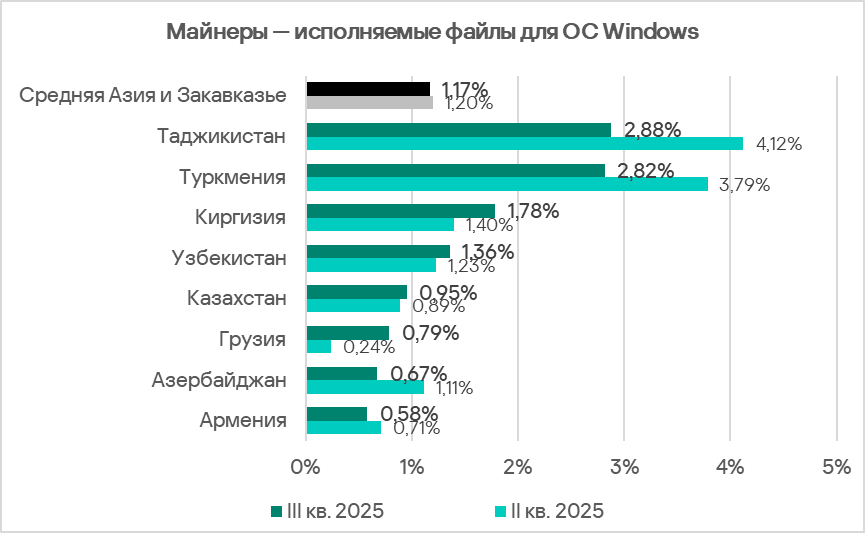 Отметим также, что Таджикистан и Туркмения лидируют в рейтинге по майнерам — исполняемым файлам для ОС Windows.