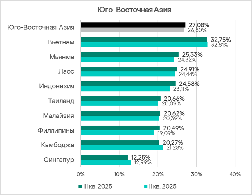 В странах региона доля компьютеров АСУ, на которых были заблокированы вредоносные объекты, варьирует от 12,25% в Сингапуре до 32,75% во Вьетнаме. Показатели остальных стран — в диапазоне от 20% до 26%.