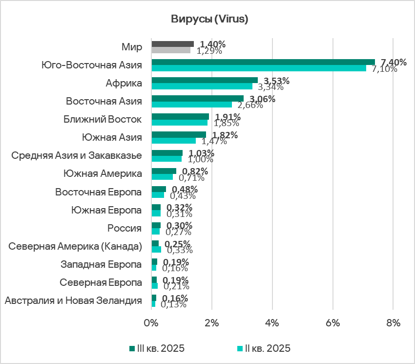 В Юго-Восточной Азии в рейтинге категорий угроз вирусы находятся на втором месте. Это единственный регион, где эта категория угроз находится насколько высоко.