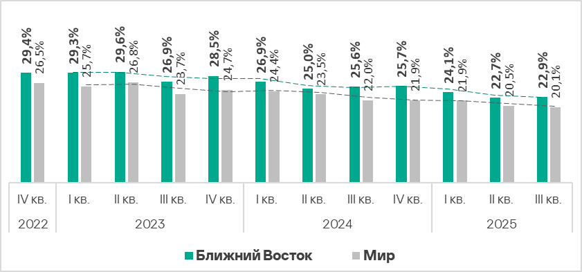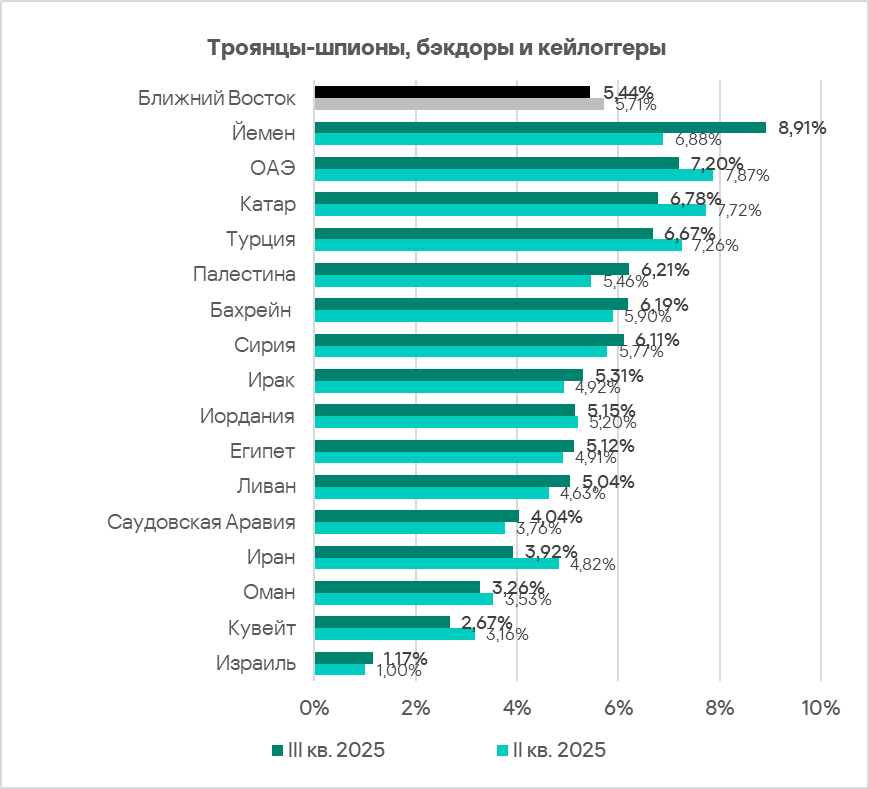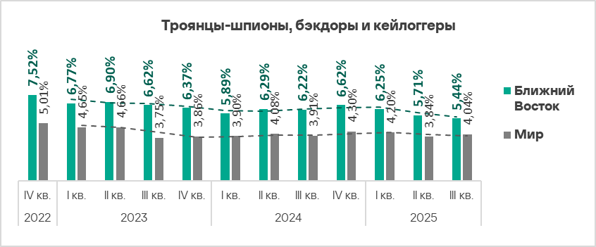 На Ближнем Востоке доля компьютеров АСУ, на которых блокируются шпионские программы, снижается третий квартал подряд, в третьем квартале 2025 года она была минимальной за три года.