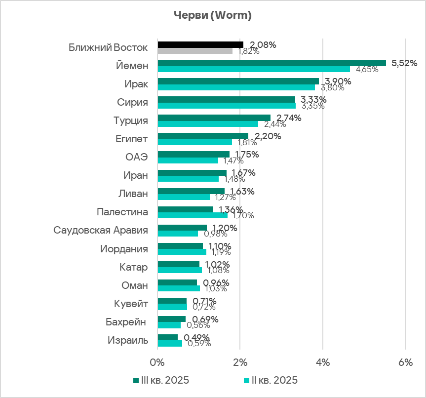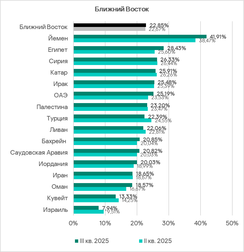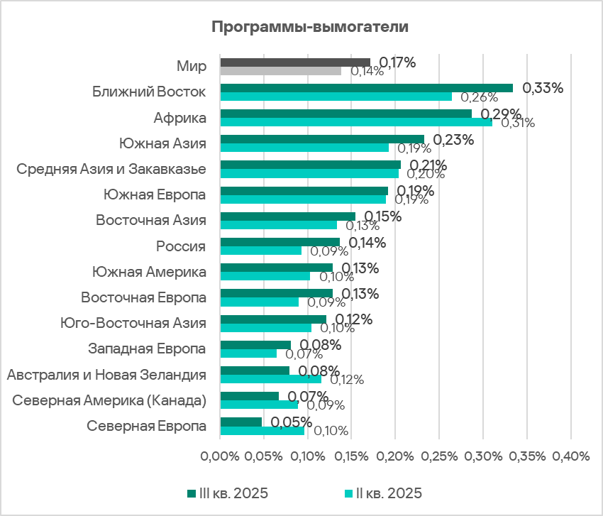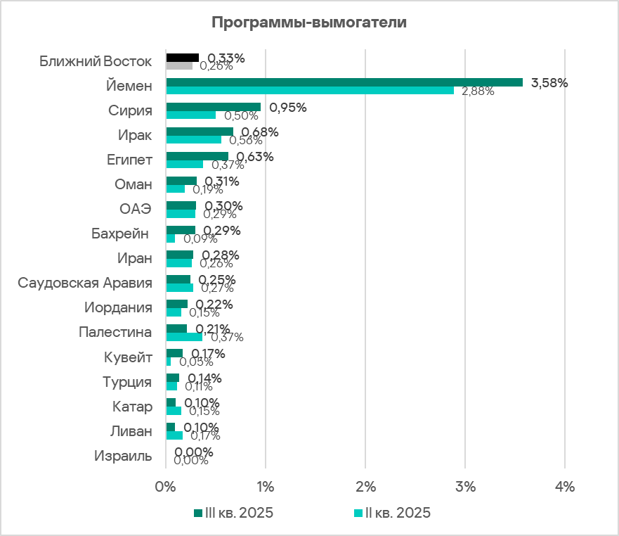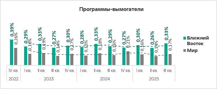 В 2024 году Ближний Восток занимал первое место в рейтинге регионов по доле компьютеров АСУ, на которых были заблокированы программы-вымогатели, в первом и втором кварталах 2025 года был на втором месте. В третьем квартале 2025 года Ближний Восток вновь лидирует по показателю программ-вымогателей.