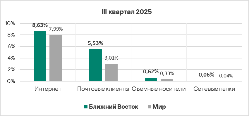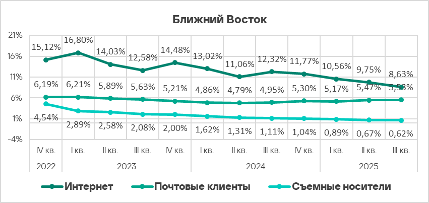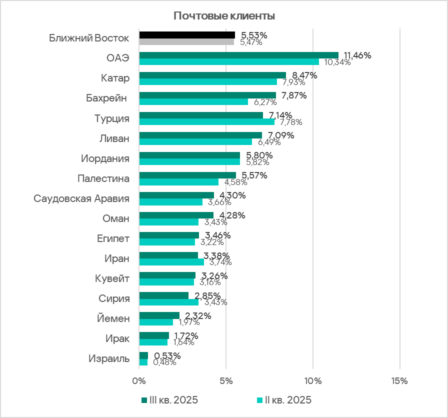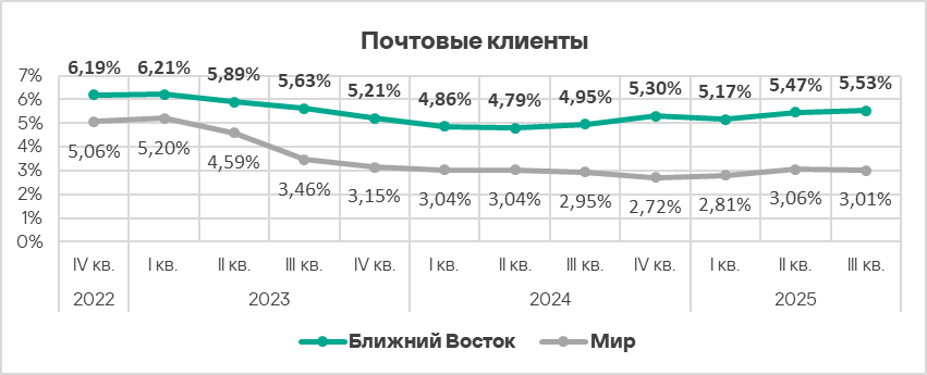 Почтовые клиенты — источник угроз в регионе, чей показатель демонстрирует тенденцию к росту с третьего квартала 2024 года. По доле компьютеров АСУ, на которых были заблокированы угрозы из почтовых клиентов, в третьем квартале 2025 года Ближний Восток среди регионов занимает второе место с 5,53%. Это в 7,1 раза больше, чем в России, которая замыкает этот рейтинг.