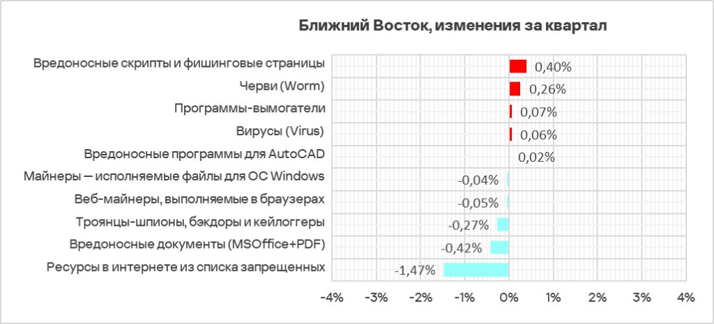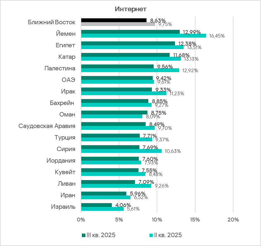 По доле компьютеров АСУ, на которых были заблокированы угрозы из интернета, Ближний Восток занимает пятое место в рейтинге регионов с показателем 8,63%, который превышает минимальный — у Северной Европы — в 1,9 раза.