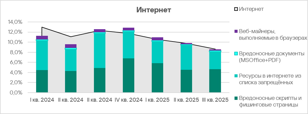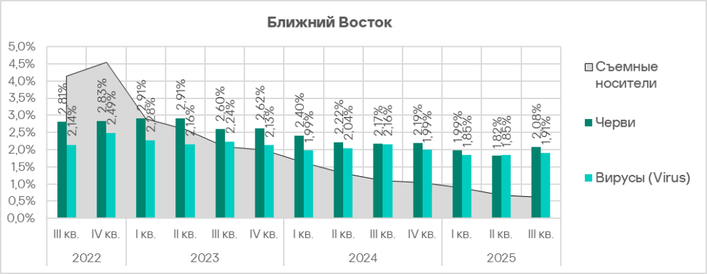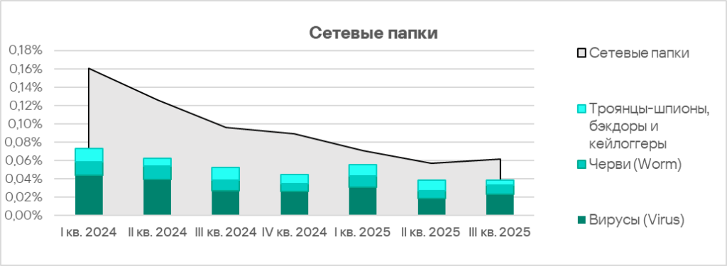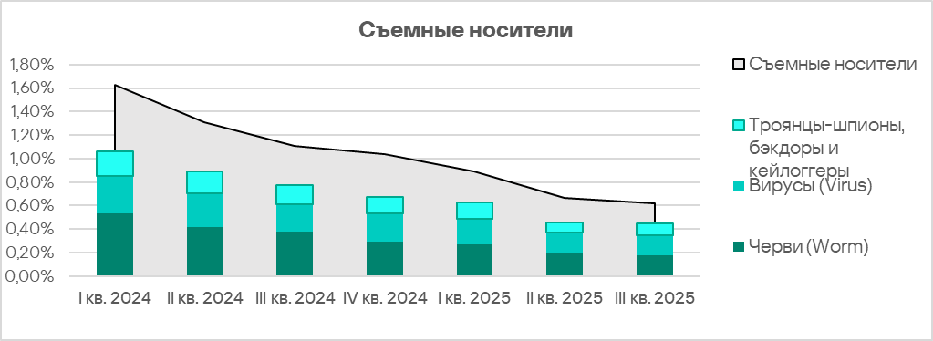 Показатель червей и вирусов, как и доля угроз со съемных носителей в целом, с некоторыми колебаниями постепенно снижается, хотя и отстает в этом показателей съемных носителей. В третьем квартале 2025 года значения обеих категорий угроз увеличились.