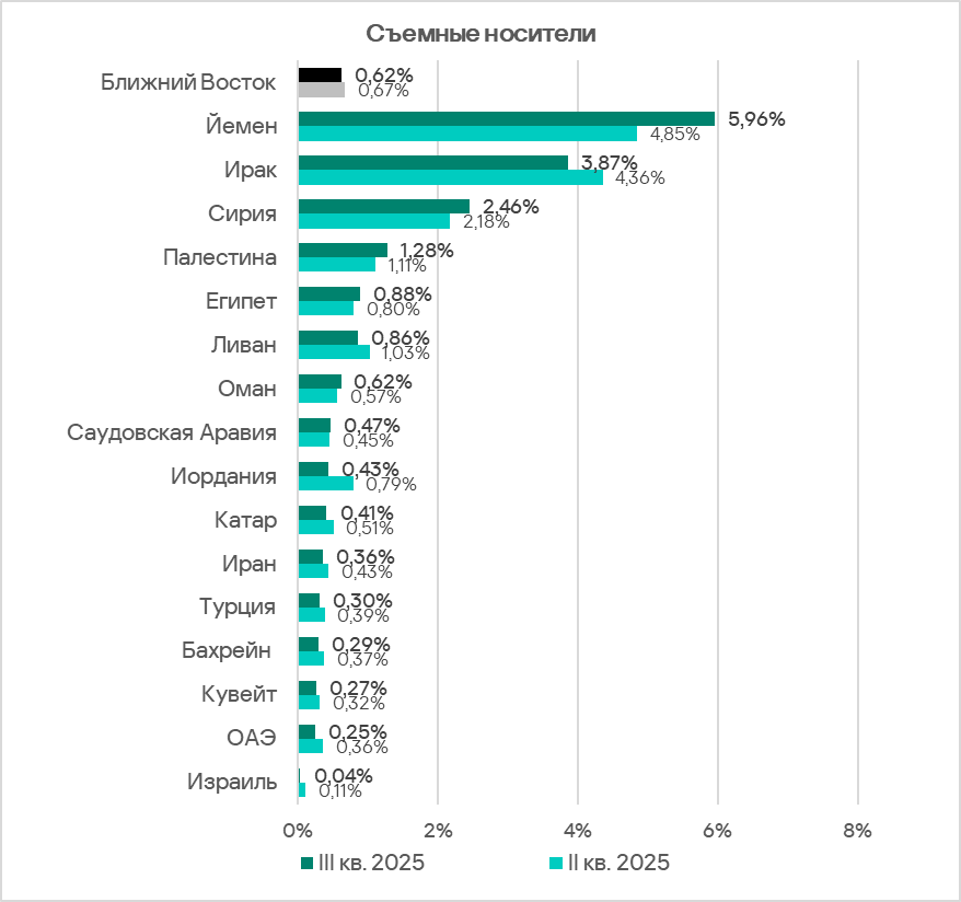 Среди стран и территорий региона по доле компьютеров АСУ, на которых были заблокированы угрозы при подключении съемных носителей, лидируют Йемен с 5,96% и Ирак с 3,87%. Показатели остальных стран варьируют от 0,04% в Израиле до 2,46% в Сирии.