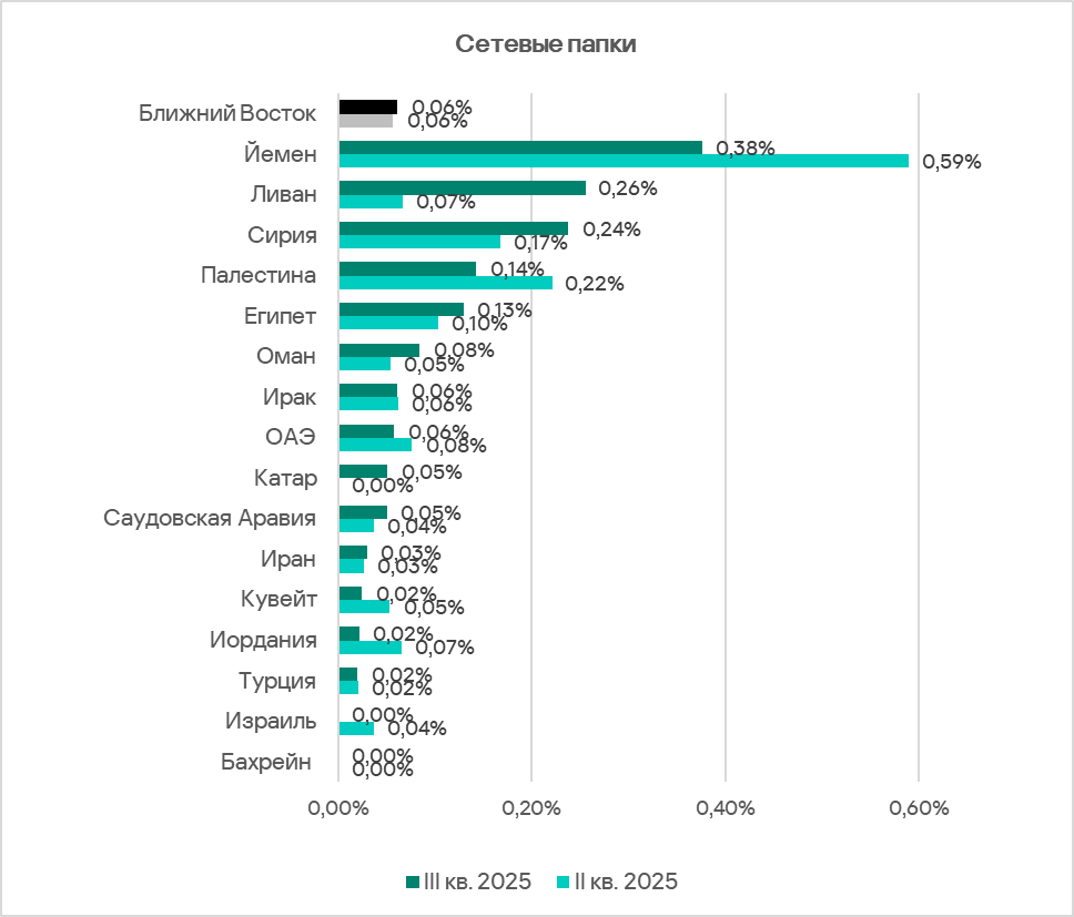 По доле компьютеров АСУ, на которых угрозы блокируются в сетевых папках, в третьем квартале 2025 года Ближний Восток занимает третье место среди регионов с 0,06%. С регионом Северная Европа, который занимает последнее место в рейтинге, показатели отличаются в 10,2 раза.