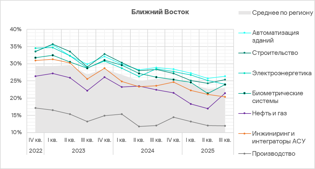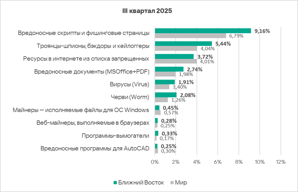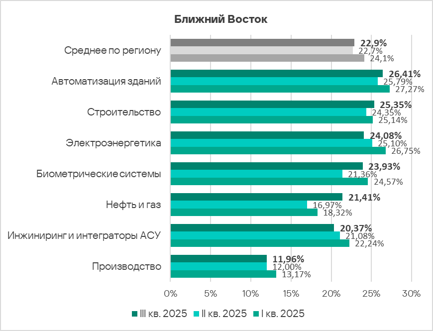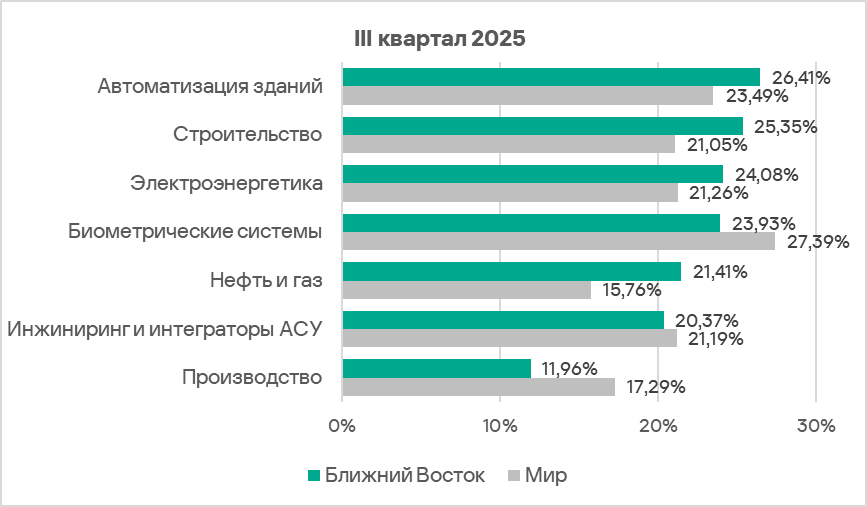 В третьем квартале 2025 года Ближний Восток занял четвертое место в мире по доле компьютеров АСУ, на которых заблокированы вредоносные объекты. Показатель в регионе стабильно превышает среднемировое значение, в третьем квартале 2025 года — в 1,1 раза.