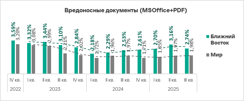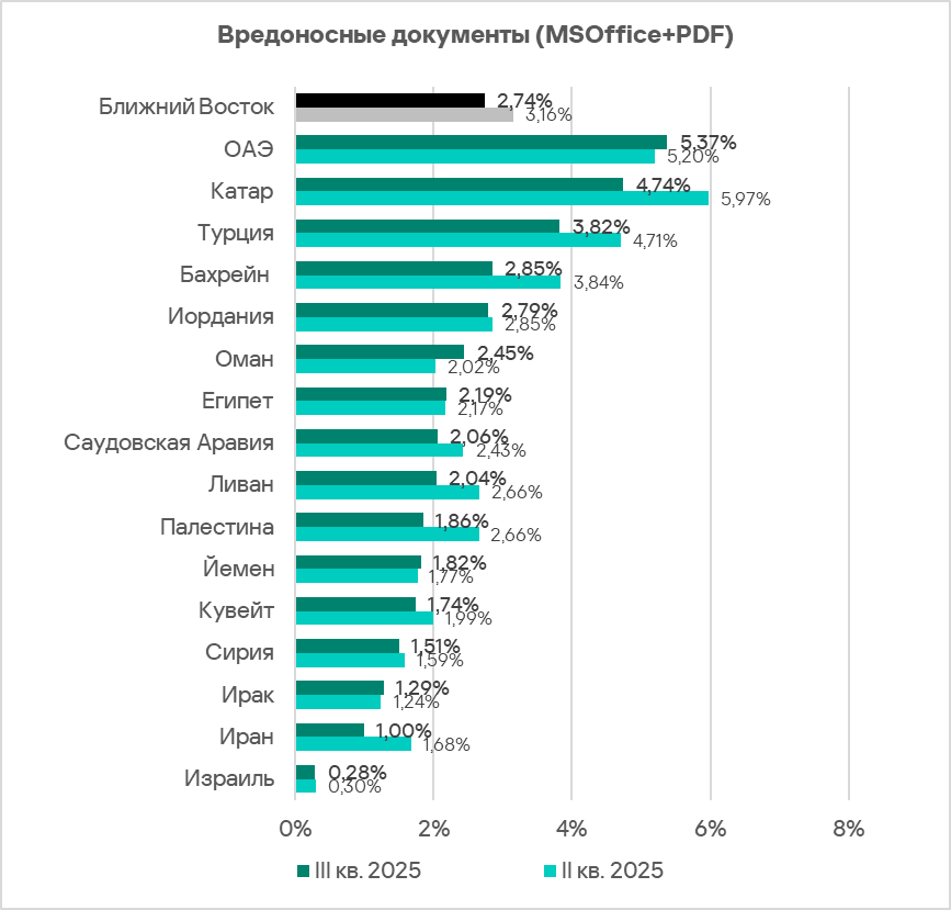 В третьем квартале 2025 года Ближний Восток по показателю вредоносных документов занимает третье место с 2,74%. Это в 5,2 раза больше, чем в Северной Европе, которая замыкает соответствующий рейтинг.