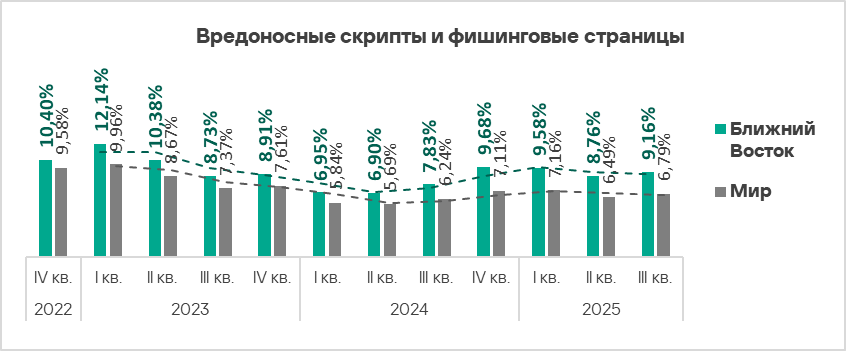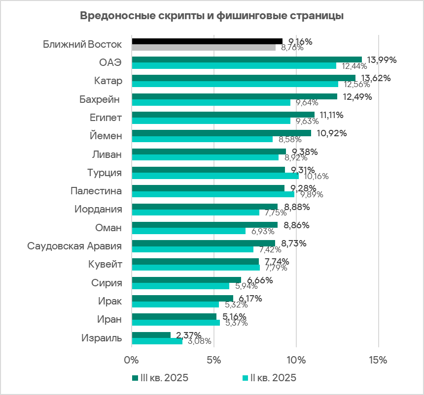 По доле компьютеров АСУ, на которых блокируются вредоносные скрипты и фишинговые страницы, Ближний Восток занимает в соответствующем рейтинге регионов четвертое место с 9,16%. Этот показатель в 3,6 раза больше, чем в Северной Европе, где он наименьший.