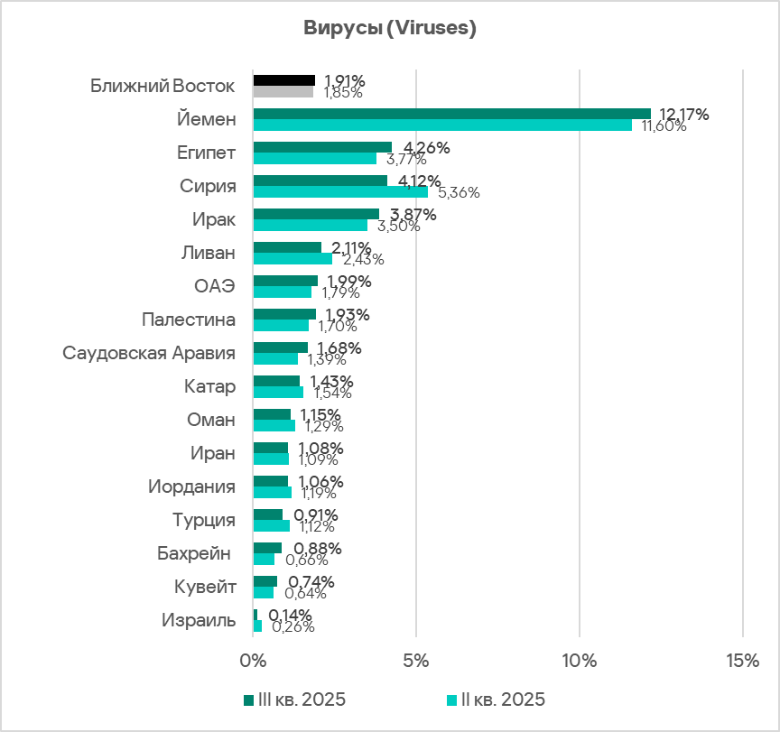 В случае вирусов показатель Йемена (12,17%) превышает показатель Египта, который занимает второе место в этом рейтинге, в 2,9 раза. По сравнению же с показателем Израиля, который замыкает рейтинг, значение в Йемене больше в 86,9 раза.