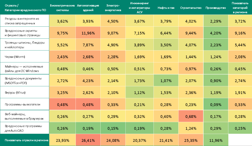 В регионе доля компьютеров АСУ, на которых были заблокированы вредоносные объекты, выше среднемирового значения у всех категорий, кроме ресурсов в интернете из списка запрещенных, майнеров — исполняемых файлов для ОС Windows, а также вредоносных программ для AutoCAD.