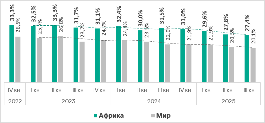 Показатели источников угроз в отраслях в Африке, III квартал 2025 года
