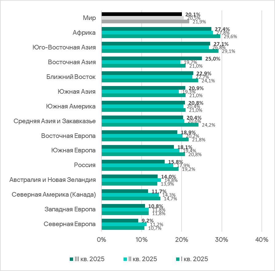 В третьем квартале 2025 года доля компьютеров АСУ, на которых были заблокированы вредоносные объекты, в Африке еще немного уменьшилась — до 27,4%. Тем не менее, показатель Африки по-прежнему больше в 1,4 раза, чем среднемировое значение. А соотношение показателей Африки и Северной Европы, которая замыкает рейтинг, увеличилось с 2,5 до 3,0 раз.