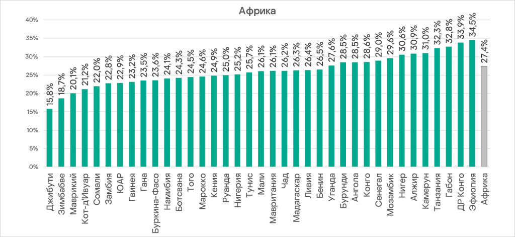 В странах региона доля компьютеров АСУ, на которых были заблокированы вредоносные объекты, варьирует от 15,8% в Джибути до 34,5% в Эфиопии.