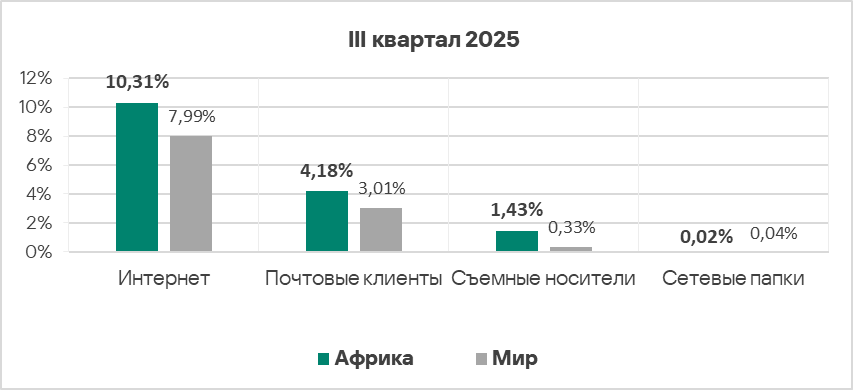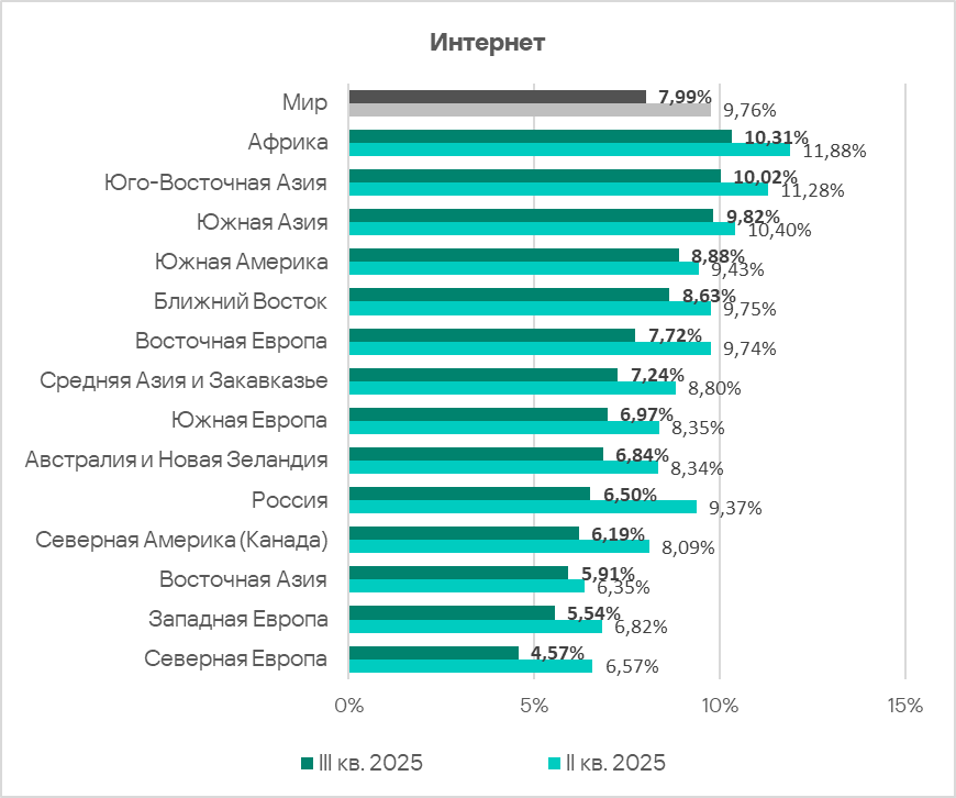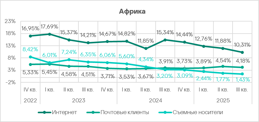 Еще один источник угроз, по которому Африка лидирует среди регионов, — интернет. В третьем квартале 2025 года по доле компьютеров АСУ, на которых были заблокированы угрозы из интернета, показатель Африки (10,31%) превышает показатель Северной Европы, которая занимает последнее место в соответствующем рейтинге, в 2,3 раза.