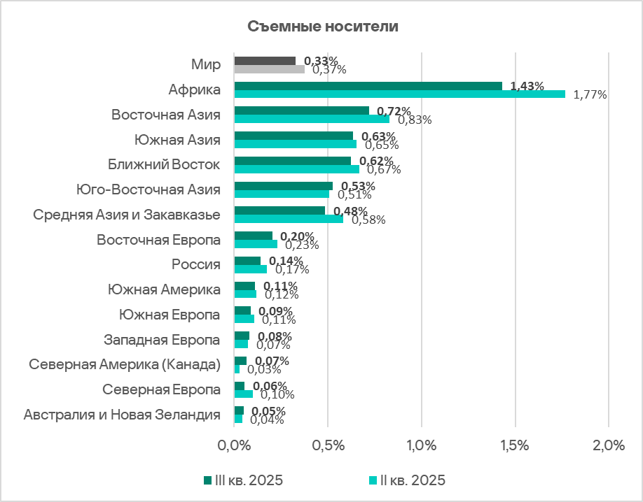 Доля компьютеров АСУ, на которых угрозы были заблокированы при подключении съемных носителей, в регионе в третьем квартале 2025 года превышает аналогичный среднемировой показатель в 4,3 раза. По этому показателю Африка с большим отрывом лидирует среди регионов.