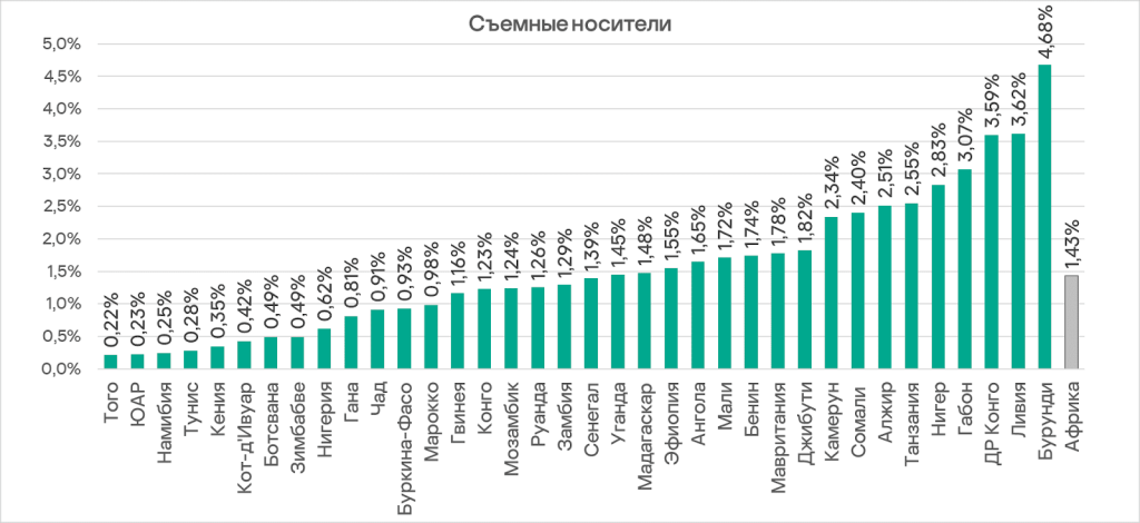 Среди стран региона по доле компьютеров АСУ, на которых были заблокированы угрозы при подключении съемных носителей, с отрывом лидирует Бурунди с 4,68%. Показатели остальных стран варьируют от 0,22% в Того до 3,62% в Ливии.