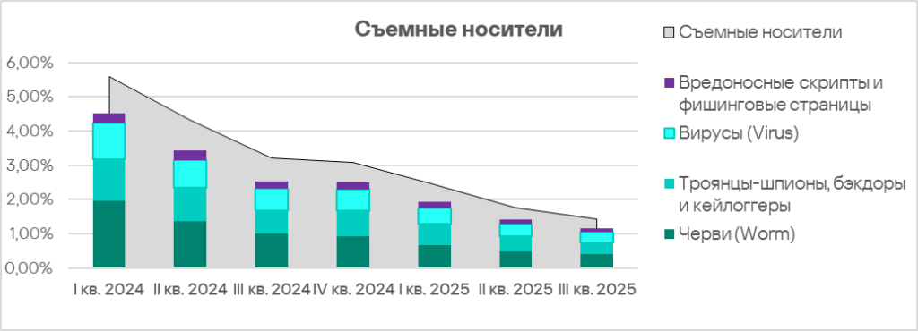 В третьем квартале 2025 года значения по всем источникам угроз, кроме сетевых папок, в регионе превышают среднемировые. В случае съемных носителей это превышение весьма значительно – в 4,3 раз.