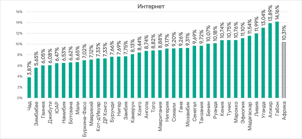 Среди стран региона по этому показателю лидирует Габон с 14,16%. Заметно меньше, чем в остальных странах, доля компьютеров АСУ, на которых были заблокированы угрозы из интернета, в Чаде (3,87%).