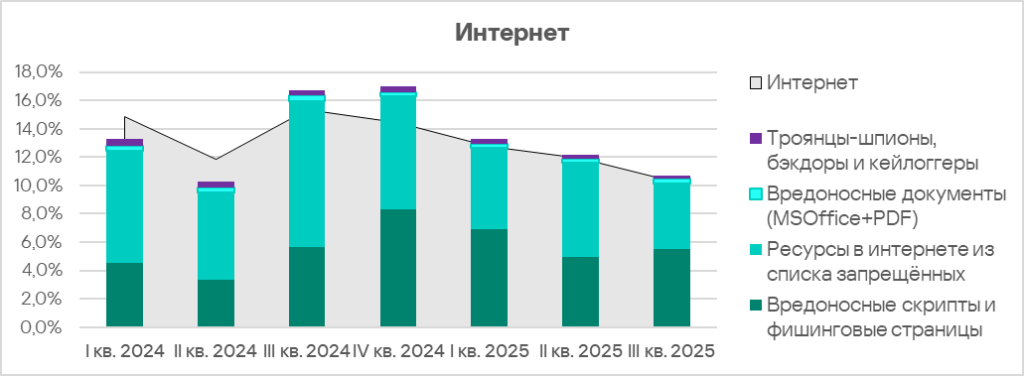 Основные категории угроз из интернета, которые в третьем квартале 2025 года были заблокированы на компьютерах АСУ, — это вредоносные скрипты и фишинговые страницы, интернет-ресурсы из списка запрещенных, вредоносные документы и шпионские программы.
