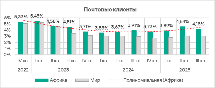 После роста в течение первых двух кварталов 2025 года, доля компьютеров АСУ, на которых угрозы были заблокированы в почтовых клиентах, в Африке снизилась. В соответствующем рейтинге регионов Африка находится на пятом месте с 4,18%. Это в 5,4 раза больше, чем в России, где показатель минимальный среди регионов.