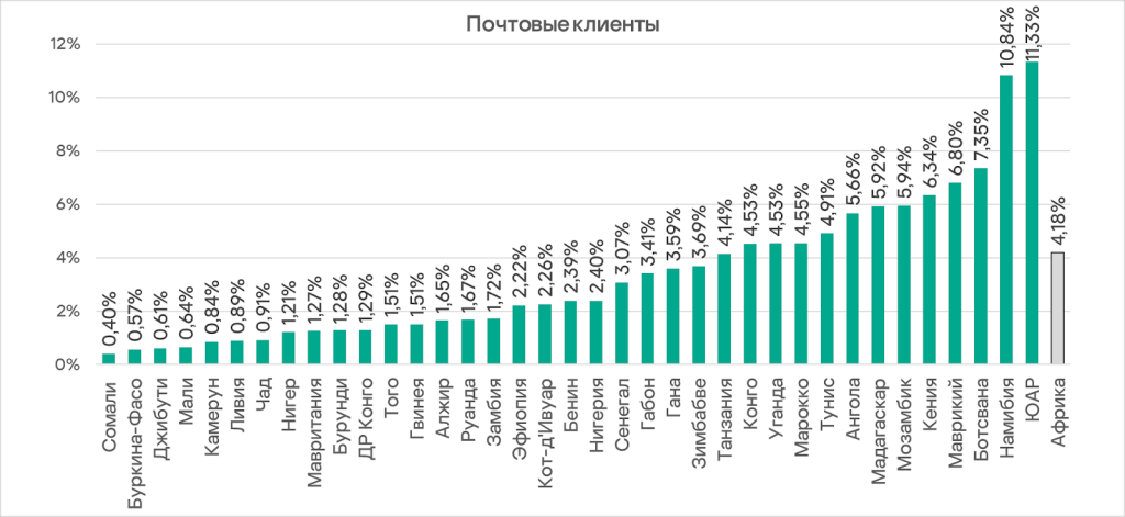 Среди стран региона по доле компьютеров АСУ, на которых угрозы были заблокированы в почтовых клиентах, явно лидируют ЮАР и Намибия с 11,33% и 10,84% соответственно. Минимальный показатель в Сомали — 0,4%.