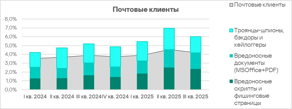 Основные категории угроз из электронной почты, которые были заблокированы на компьютерах АСУ в третьем квартале 2025 года, — это вредоносные скрипты и фишинговые страницы, вредоносные документы и шпионское ПО.