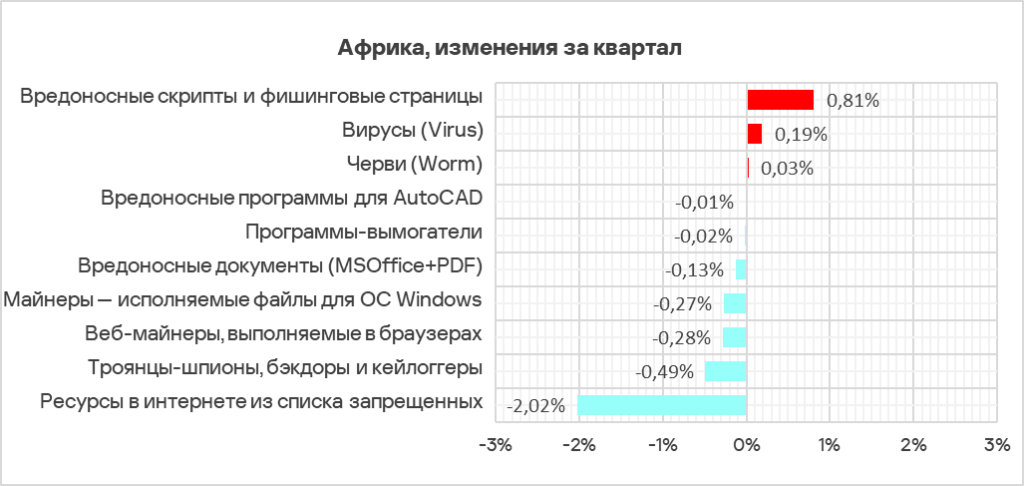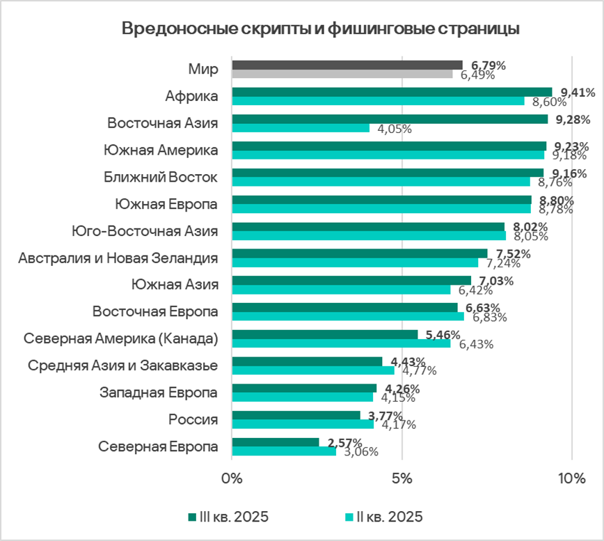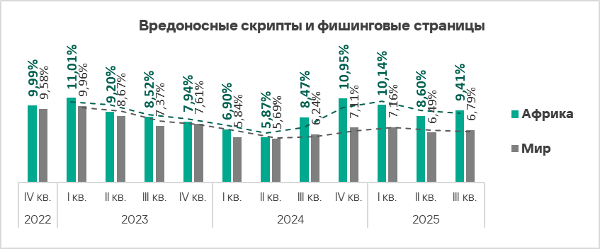 В третьем квартале Африка поднялась с четвертого на первое место в рейтинге регионов по доле компьютеров АСУ, на которых блокируются вредоносные скрипты и фишинговые страницы. Показатель за квартал увеличился до 9,41%. Это в 3,7 раза больше, чем в Северной Европе, где значение минимальное.