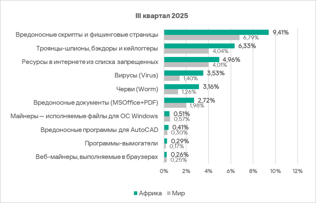 Основные категории угроз, которые в третьем квартале 2025 года были заблокированы при подключении съемных носителей к компьютерам АСУ, — черви, шпионское ПО, вирусы и вредоносные скрипты. По доле компьютеров АСУ, на которых блокировались эти категории угроз, Африка также лидирует среди регионов (по вирусам — на втором месте в рейтинге).