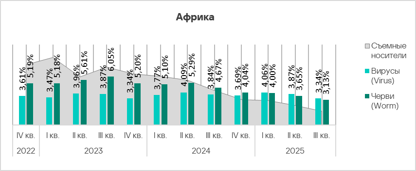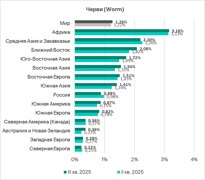 Доля компьютеров АСУ, на которых блокируются черви, в Африке в третьем квартале 2025 года немного увеличилась — до 3,16%. Этот показатель в 14,4 раза выше, чем показатель Северной Европы, которая замыкает соответствующий рейтинг.